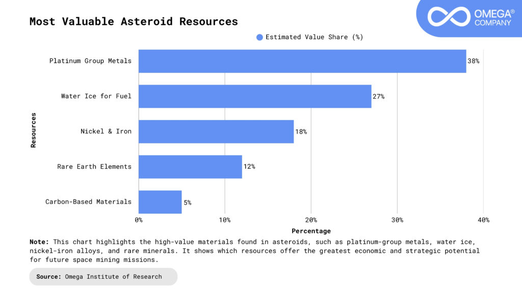 Platinum-Group Metals (PGMs): Platinum-group metals such as platinum, palladium, and iridium are among the most valuable elements found on asteroids, holding immense importance for electronics, clean energy, and industrial applications. Their extreme scarcity on Earth makes them expensive, but many asteroids contain them in surprisingly high concentrations. Extracting PGMs from space could provide a new supply chain that reduces pressure on Earth’s limited reserves while making advanced technologies more affordable. This abundance could reshape global markets, fuel innovation, and drive a multi-trillion-dollar space resource economy.