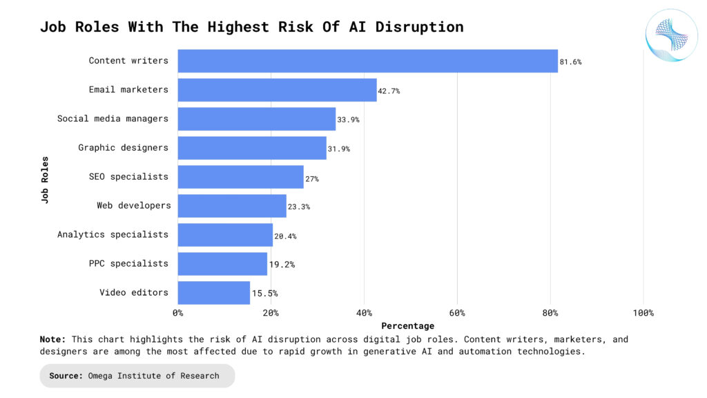 Content Writers (Routine and SEO): AI content generators can produce SEO-optimized articles, social media captions, and product descriptions at scale. While high-concept writing still needs human input, low-level content creation is being automated. This automation increases efficiency for brands but reduces demand for entry-level or repetitive writing roles.
