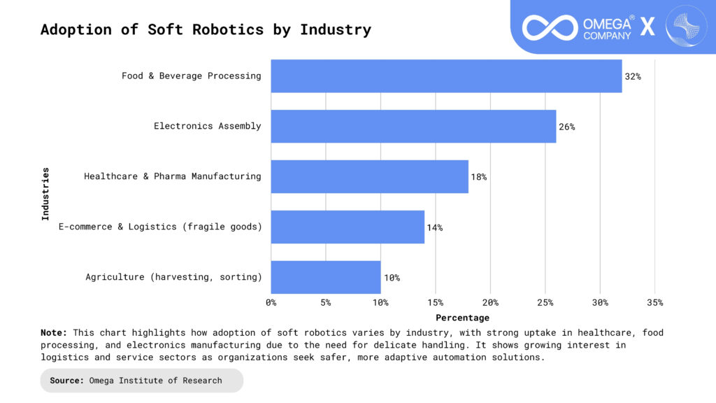 Soft robotics is a strategic enabler of next-generation manufacturing, allowing automation in delicate, variable, and high-risk processes that traditional rigid robots cannot handle. Using flexible materials and AI-driven control systems, these robots safely manage fragile goods and precision tasks across industries like food, electronics, and pharmaceuticals. For C-suite leaders, soft robotics offers a clear pathway to boost productivity, reduce waste, improve safety, and enable scalable human–machine collaboration delivering agile, ESG-aligned, and future-ready operations. It also supports faster product innovation cycles and greater customization capabilities in competitive markets. As adoption scales, it strengthens supply chain resilience and positions organizations at the forefront of Industry 4.0 transformation.